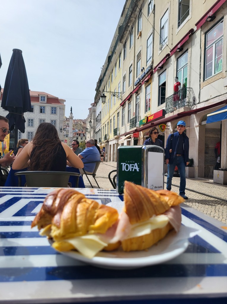 With a healthier attitude, I walked through the throngs of tourists and away from the cathedral. I needed to get into a less-touristy part of town for a sane meal. I found a plaza with a suitable café near the train station. I ordered a beer, a bottle of water, and a ham & cheese sande from a waiter that also helped me with basic Portuguese.