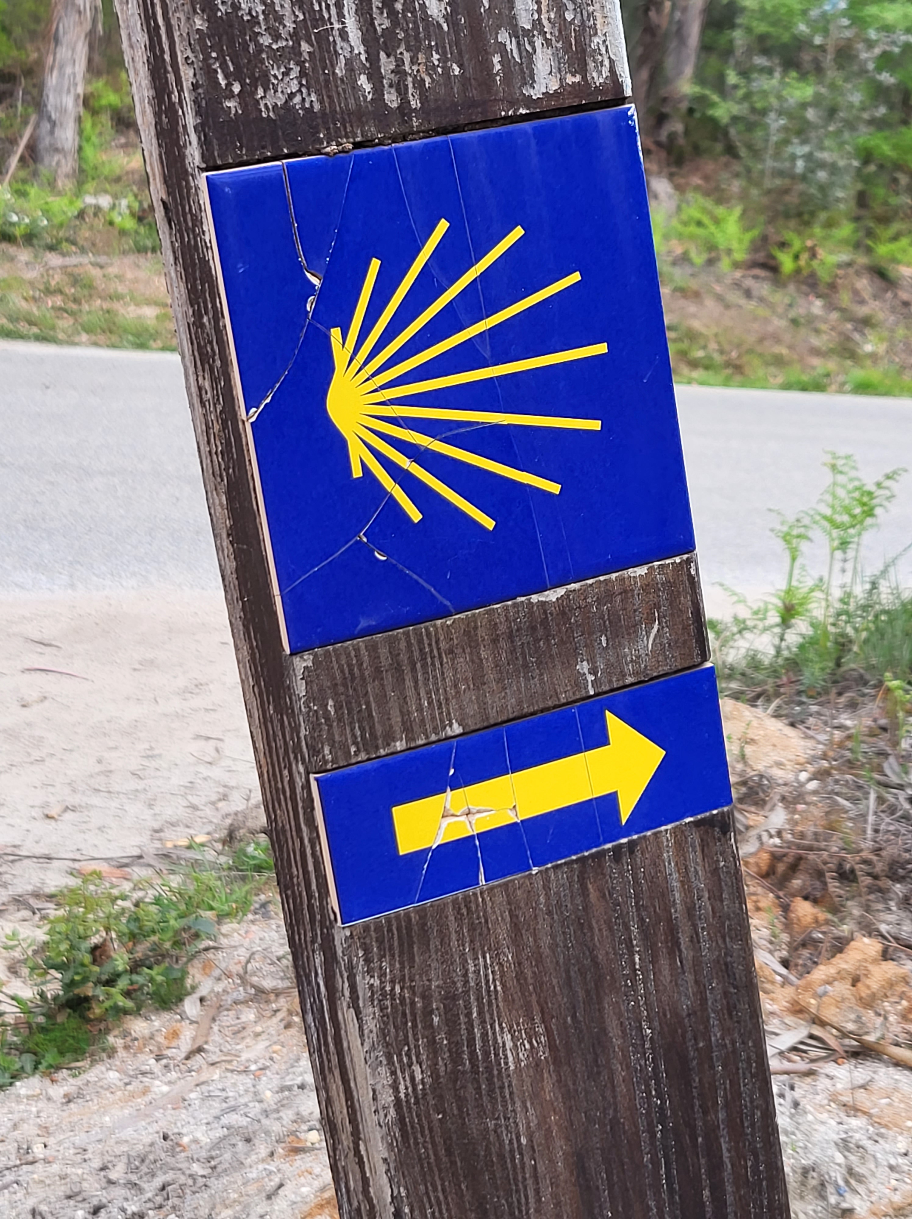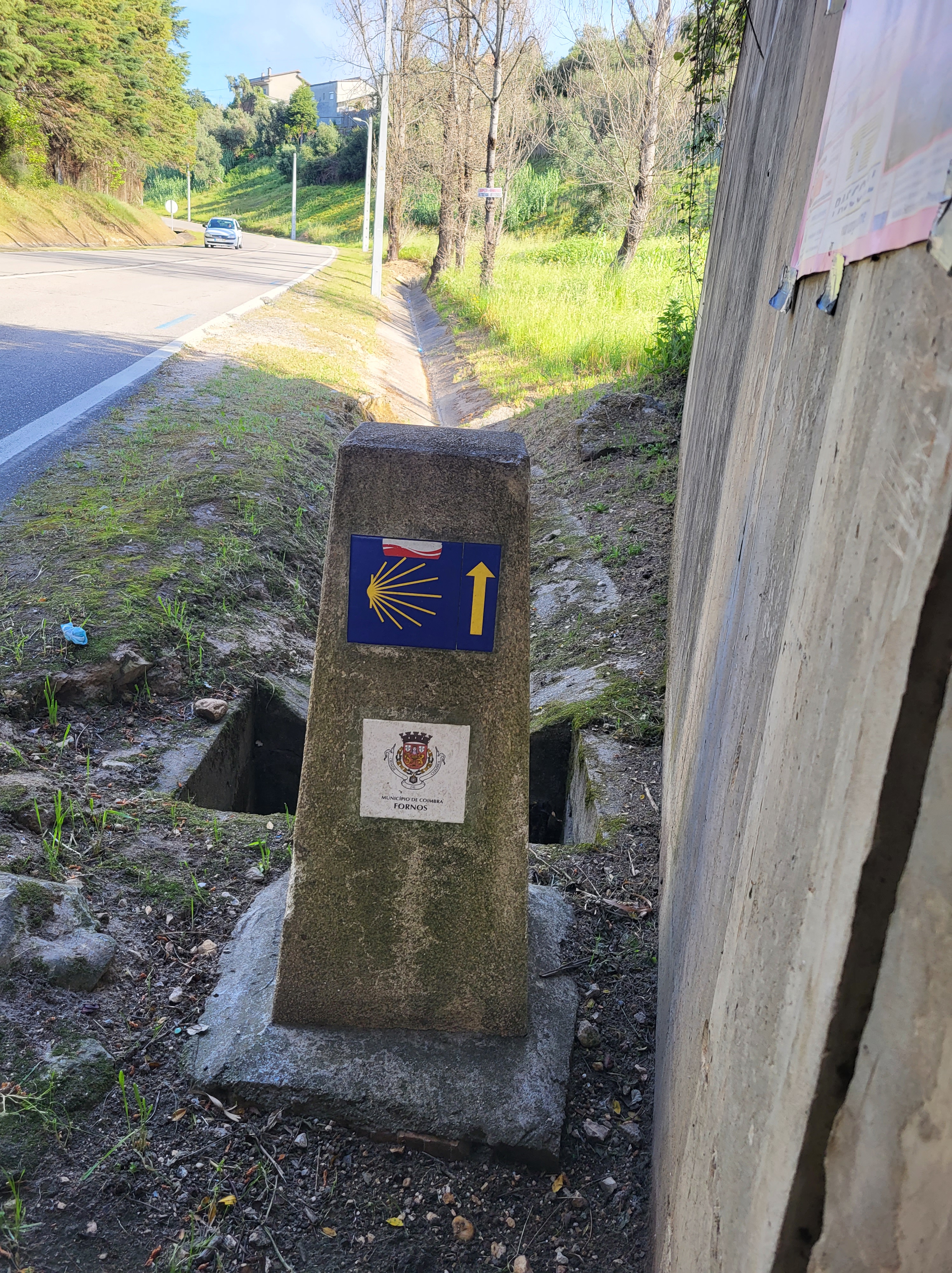 After half a kilometer, I wasn’t in the eucalyptus forest, but on a road leading to Barcouço. I walked another half a kilometer hoping to see the yellow arrow but didn’t.