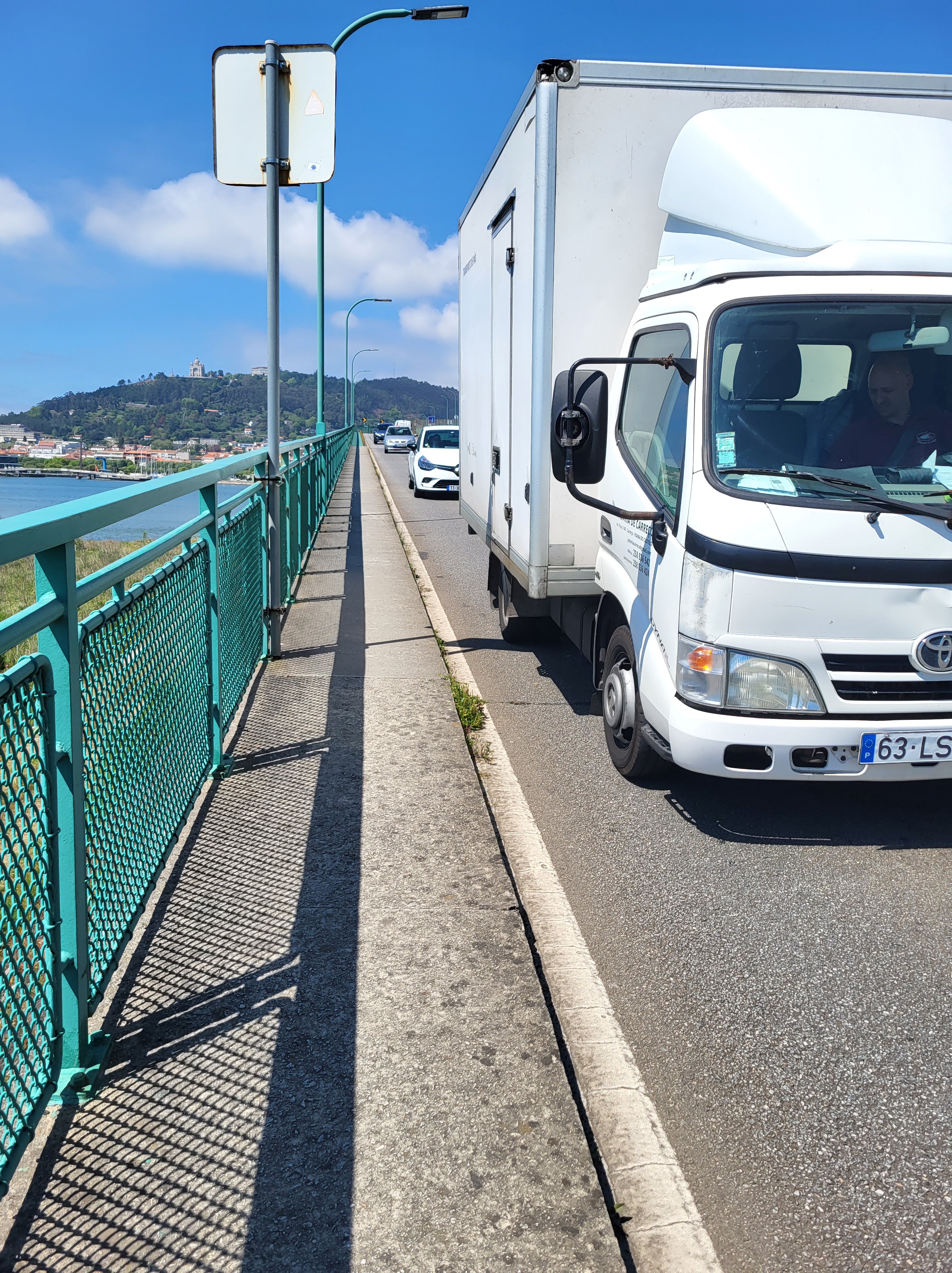 The last obstacle was the long bridge crossing the Limia River. If ever there was a place for Pilgrim Frogger Bonus Points, this was it. Heavy traffic, narrow sidewalk, a four-feet tall iron fence, and then the river far below.