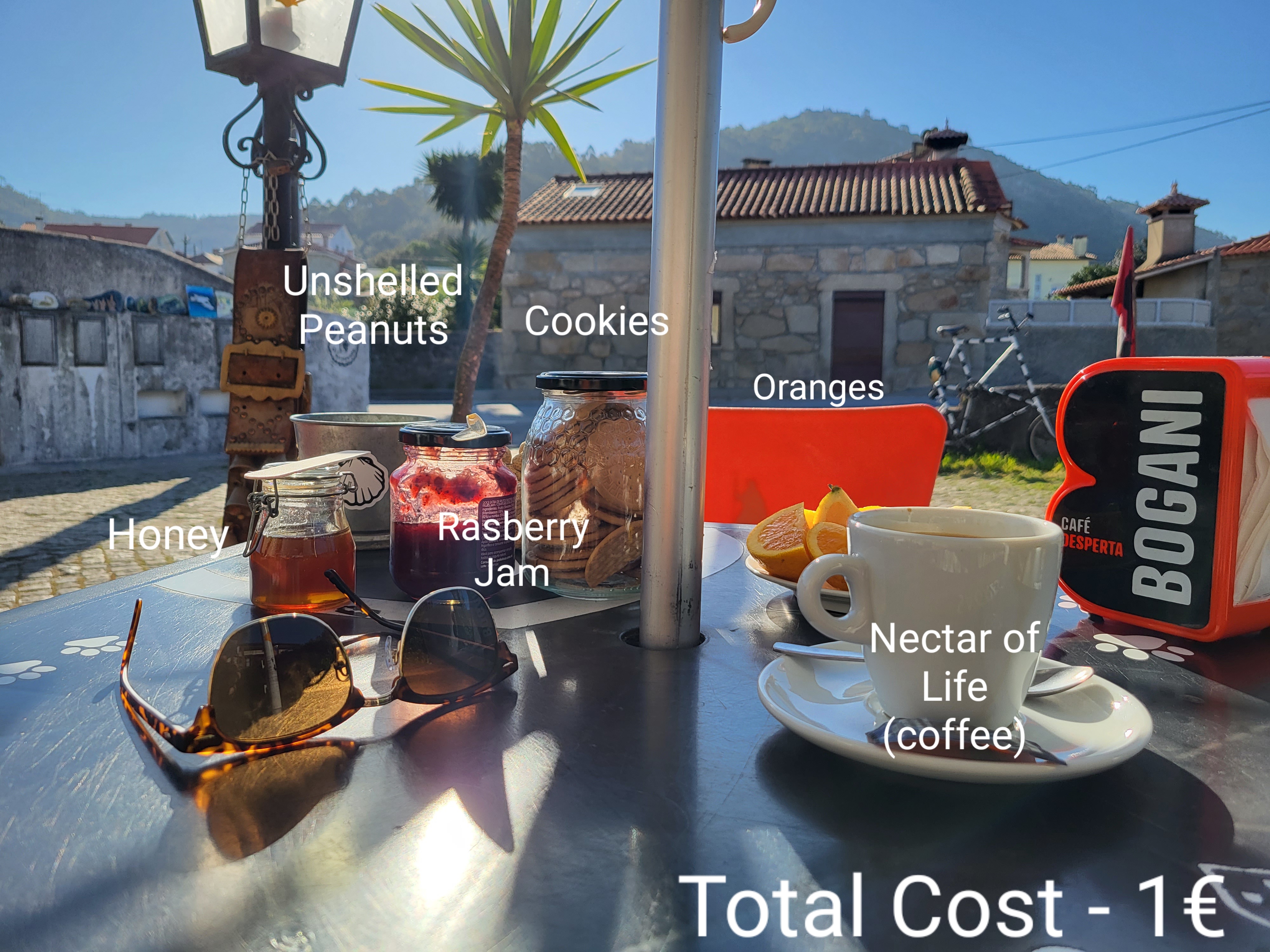 A few minutes later, the man delivered my coffee, but no food. I wondered if he had misunderstood. Before I could go back inside, he appeared with a jar of cookies and a bowl of two sliced oranges. He said he would be back. He was, another minute later. This time with fresh honey and raspberry preserves for the cookies. He came back one more time with a little tin bucket full of unshelled peanuts.