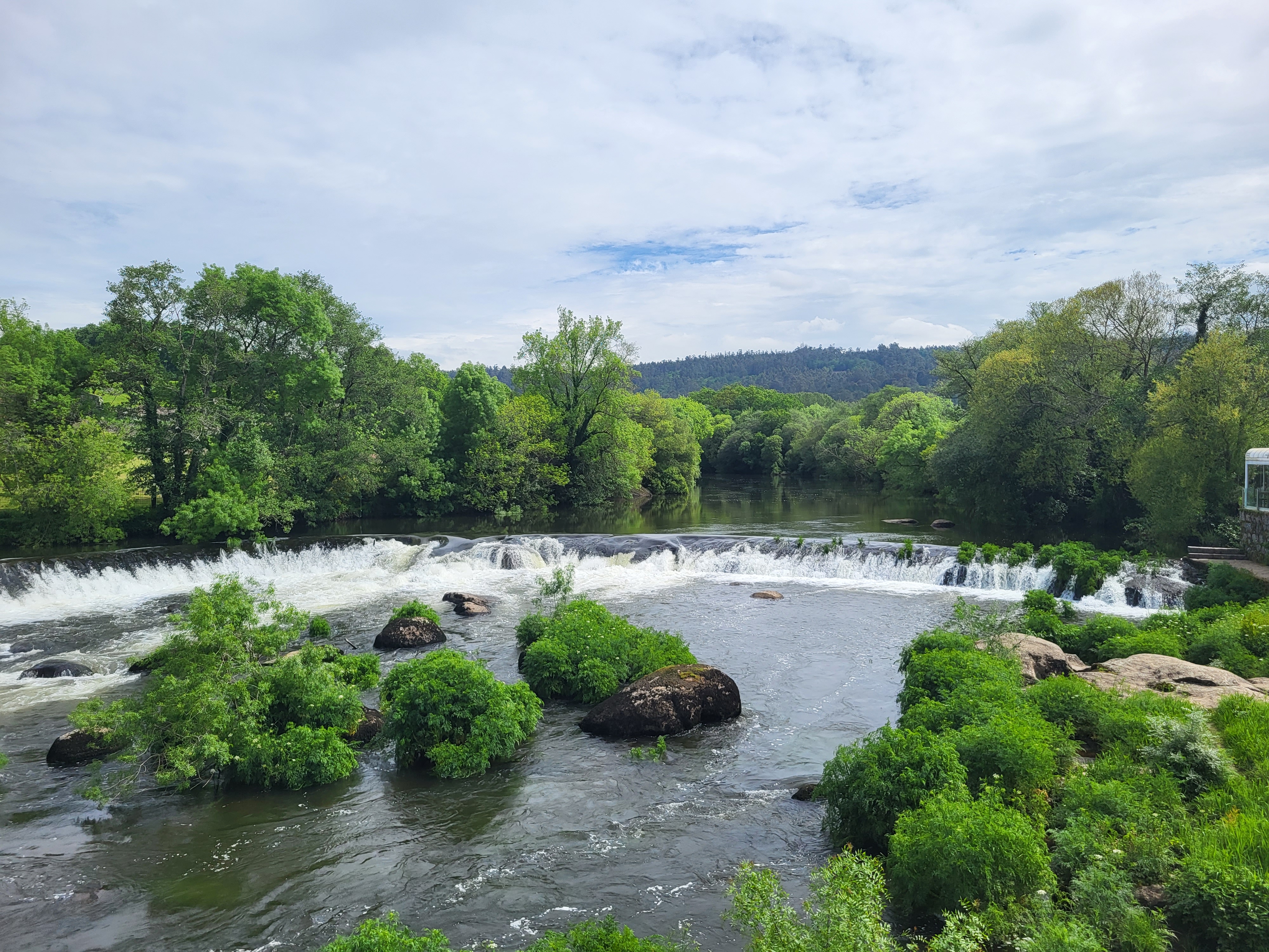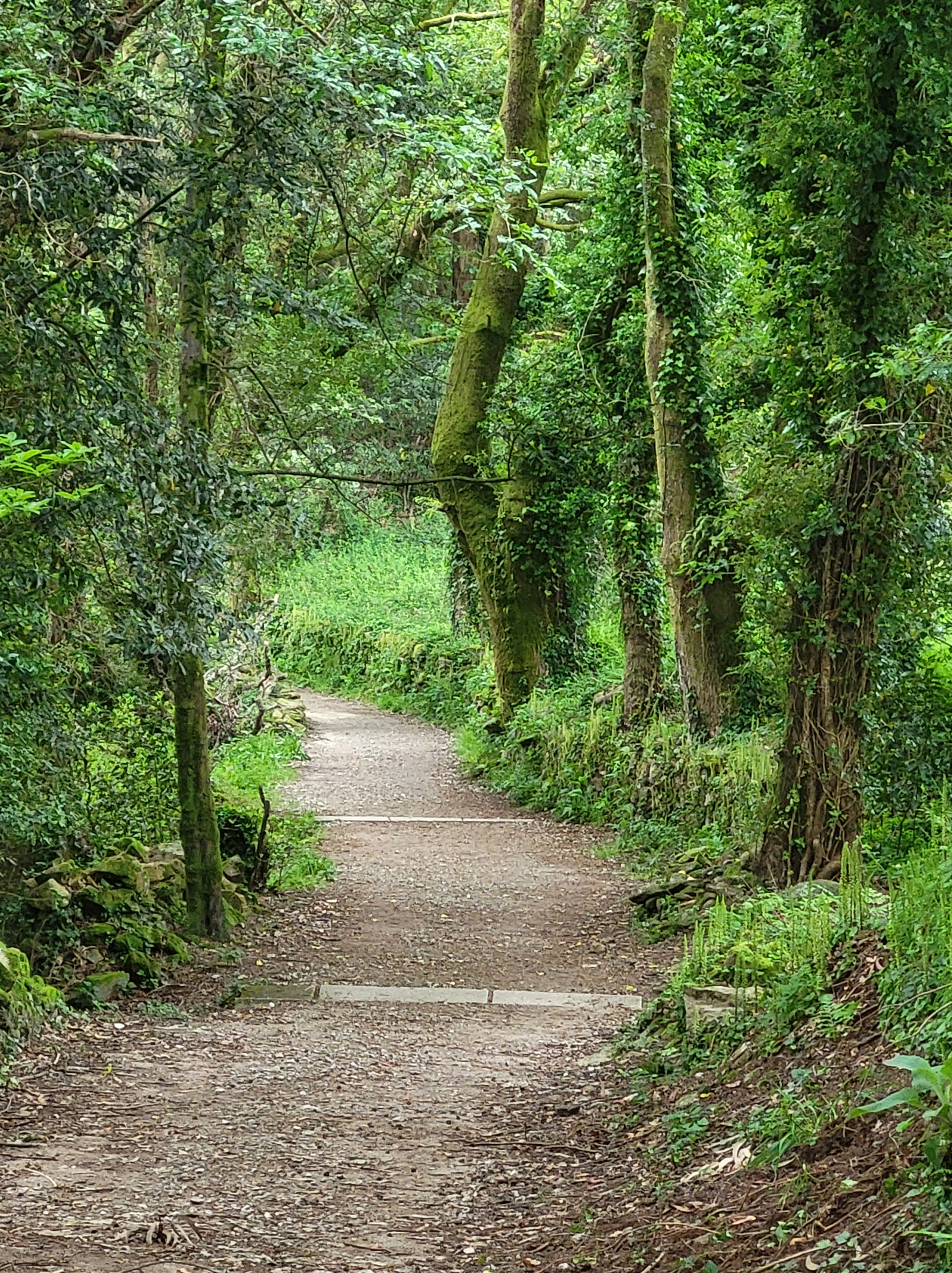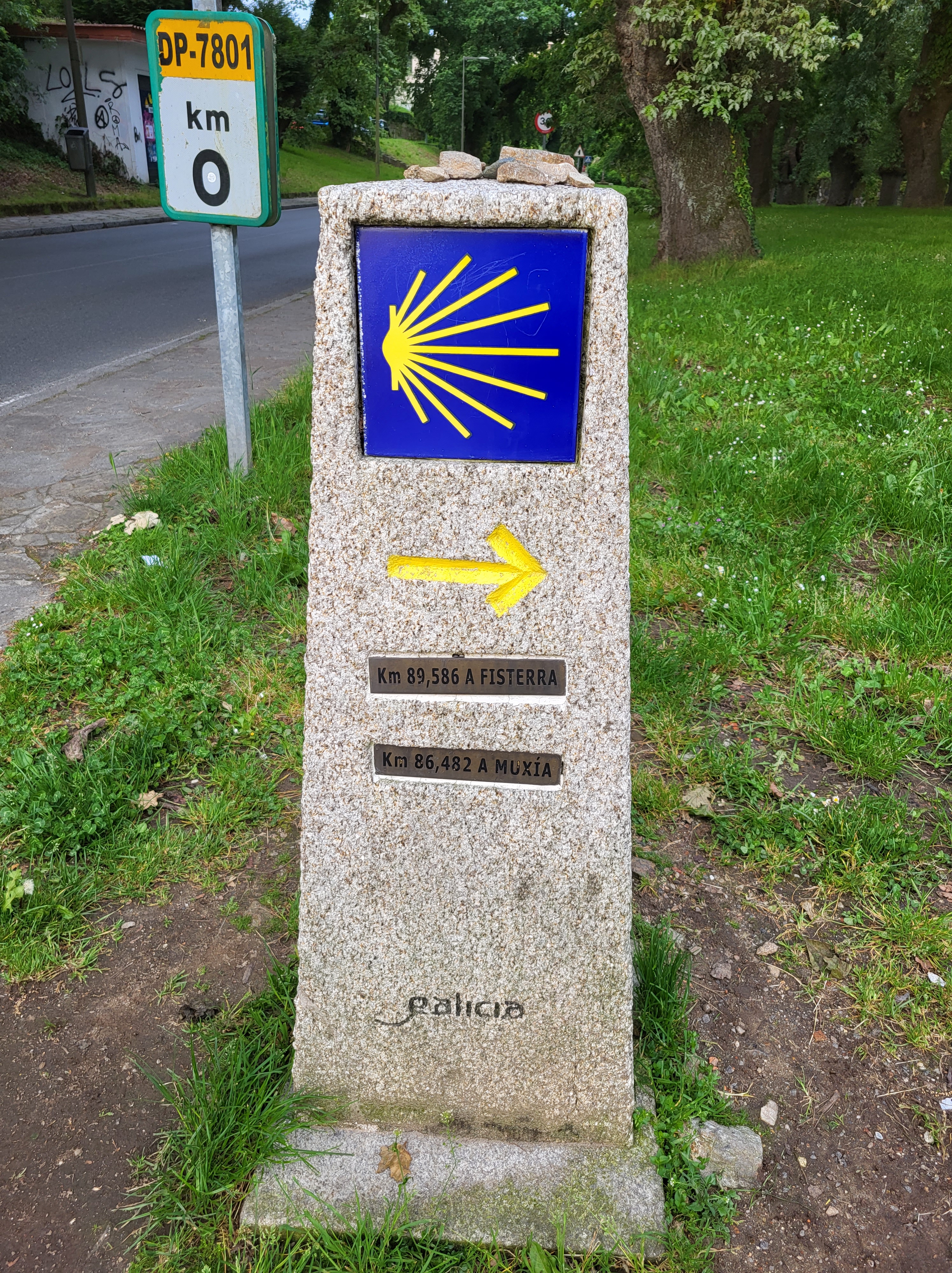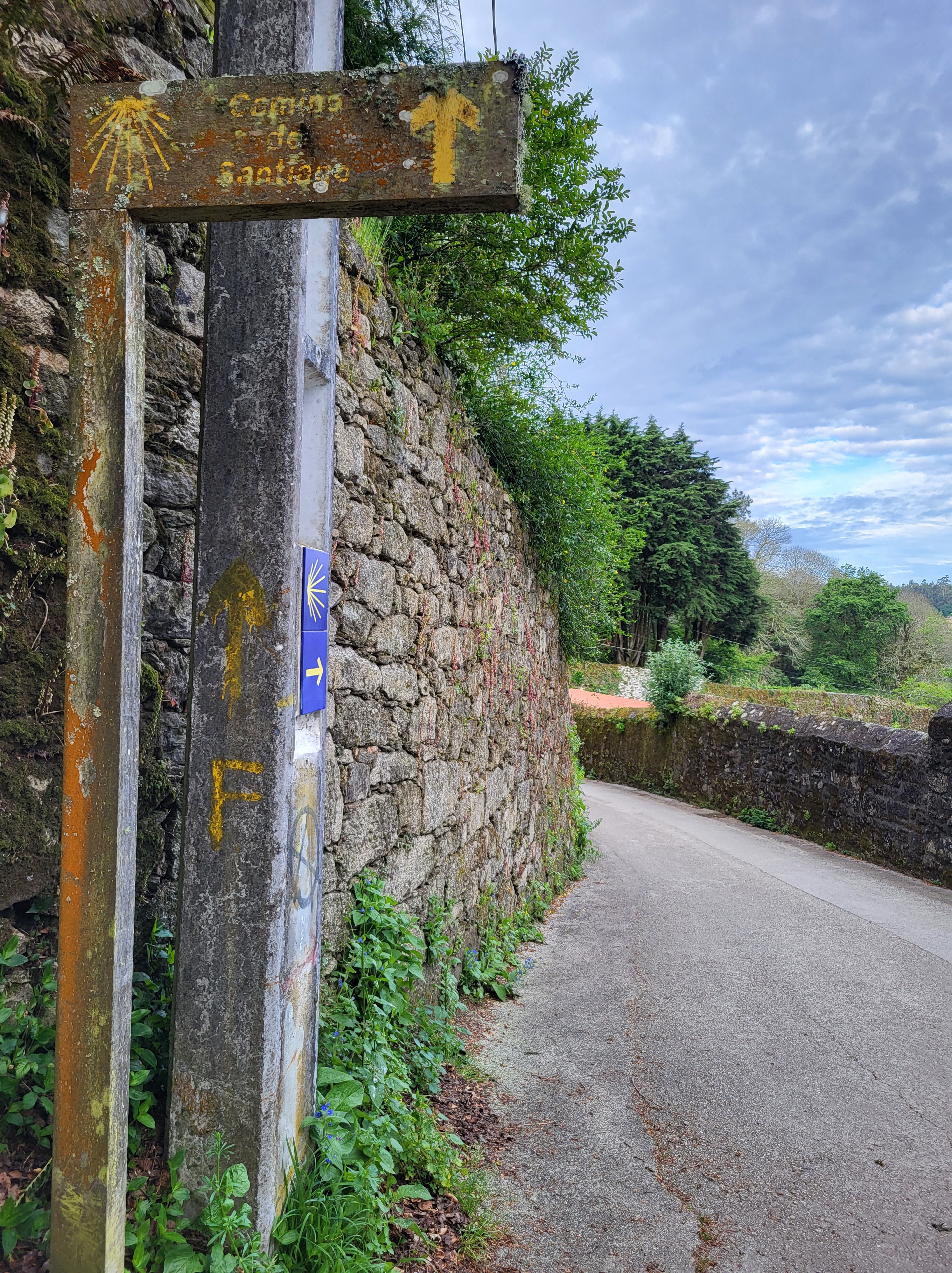 I resisted the temptation to stay, strapped on my backpack, and walked away from Santiago. It didn’t take long, maybe 1 kilometer to clear the busy part of the Old Town. The official signage for Finisterre/Muxía was at the beginning of a nice park. Not long afterwards, I was back in the Galician countryside. The same things that make this countryside beautiful coming into Santiago from either the Frances or Portugues routes are the same leaving – layers of green, rolling hills, and dense forests. It was a great walk!