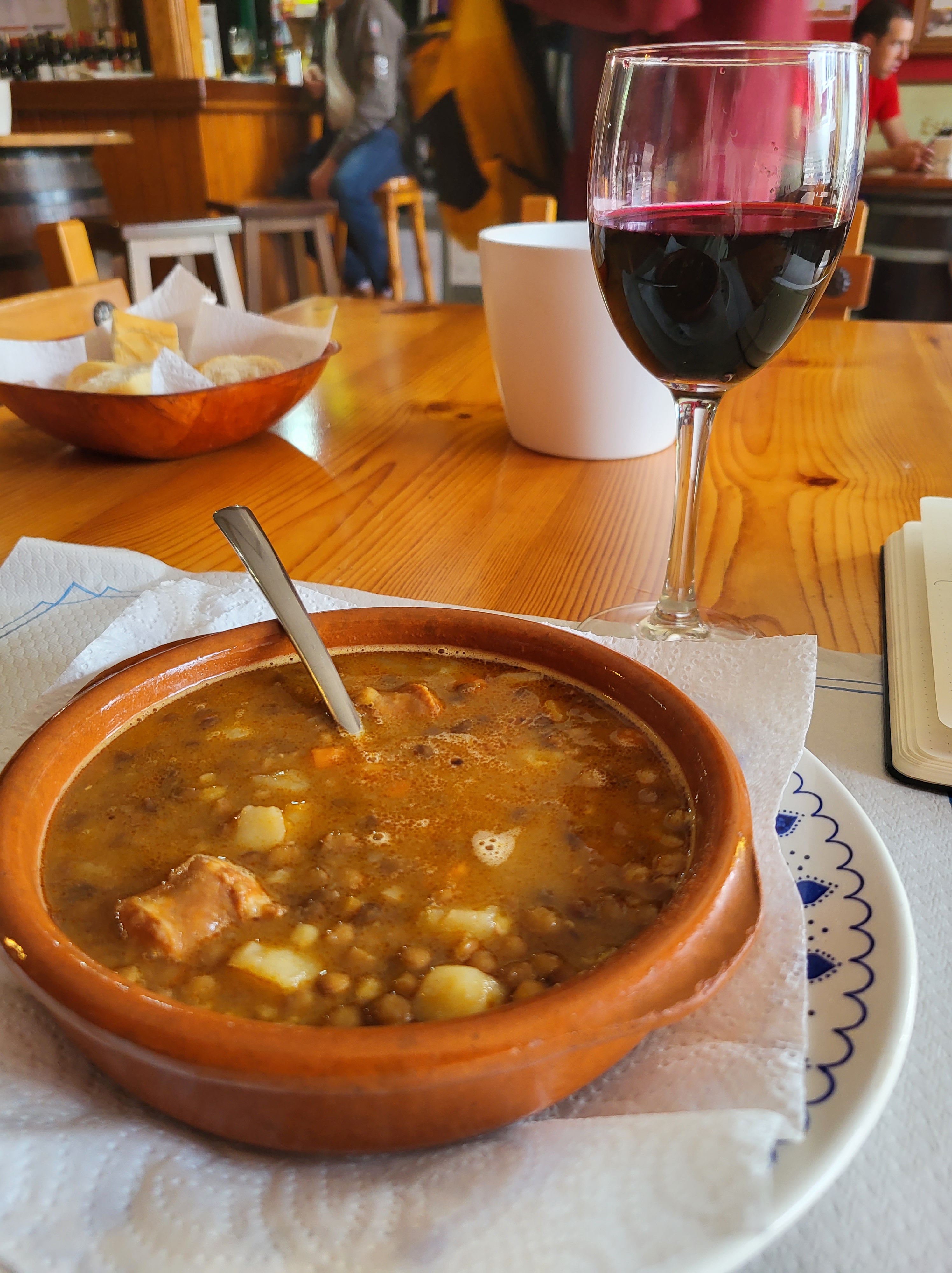 The other pilgrims (2 from US, 1 from the Netherlands, 1 from Germany, 1 from Norway) and I ate an early dinner together in the common area. Afterwards, one of the US guys and I went to a nearby cerveceria. While I was enjoying a vino tinto de Rioja and lentejas, I received a phone call.