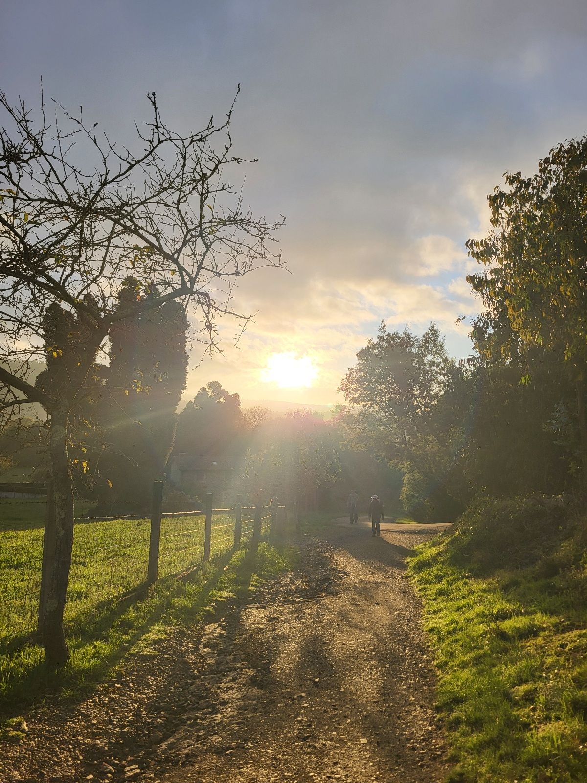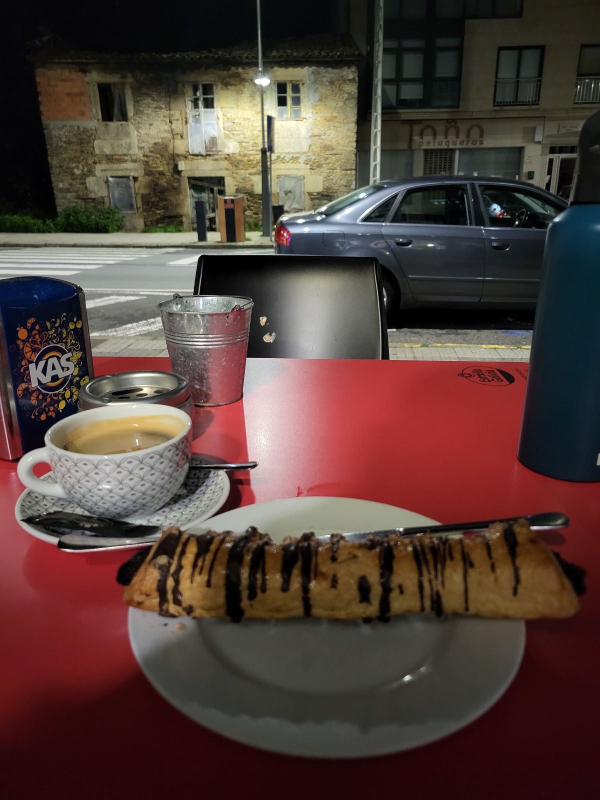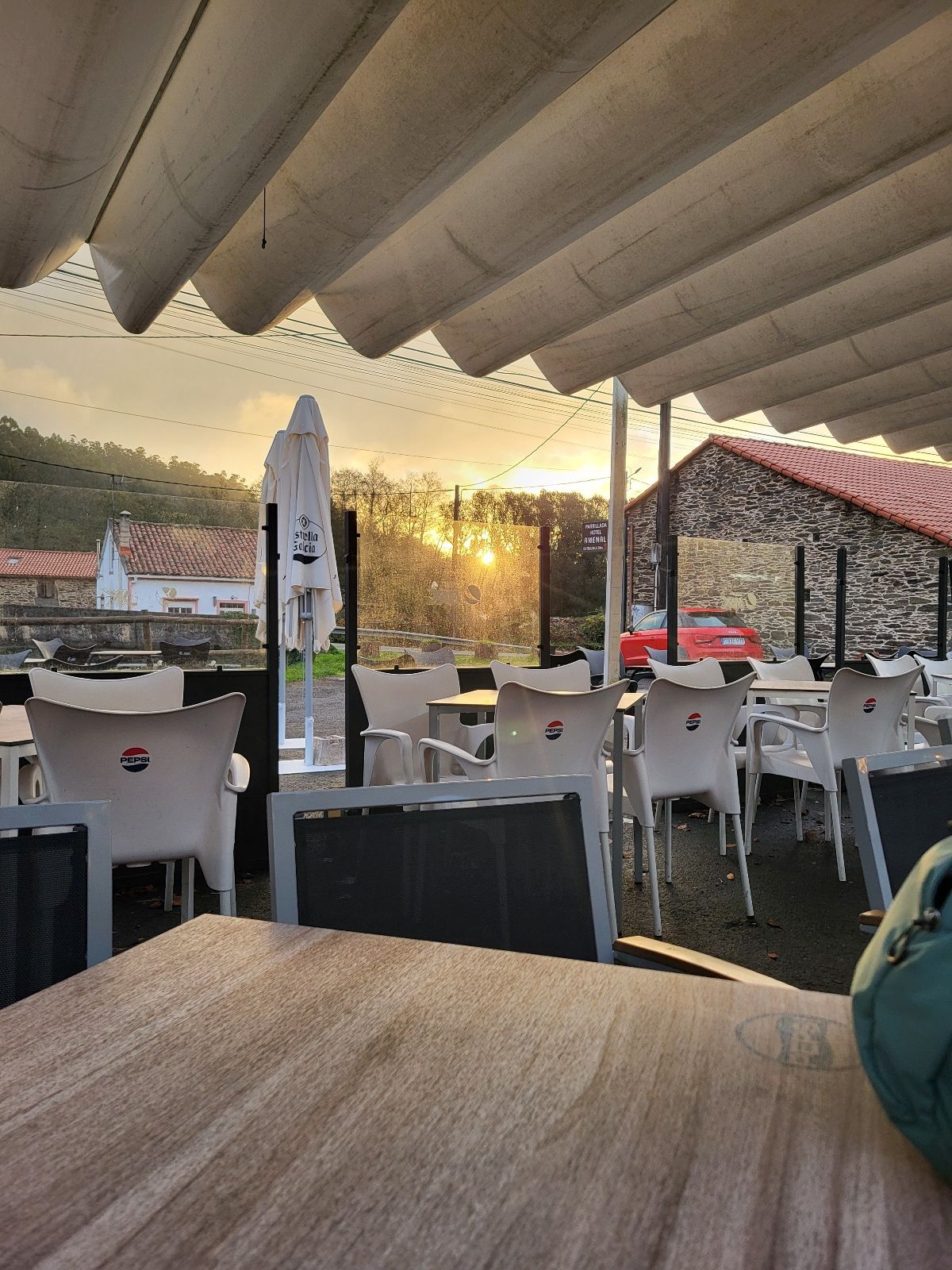 First Breakfast in O Pedrouzo, coffee is the main objective. The pic in the middle is representative of the long, lonesome walk to Second Breakfast in Amenal. There’s a three-fold objective at the Hotel Restaurante Amenal, 1 – More coffee (and another croissant), 2 – watch the sun rising over the eastern horizon, 3 – watch the hordes of pilgrims on my left racing towards Santiago.